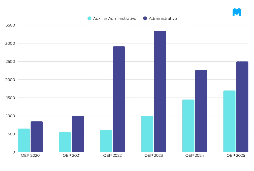 Uno de los factores más relevantes que afecta los cambios en las notas de corte entre las diferentes convocatorias es el historial de plazas convocadas para la oposición de Auxiliar Administrativo del Estado. En este gráfico de barras, puedes consultar la tendencia de los últimos años.